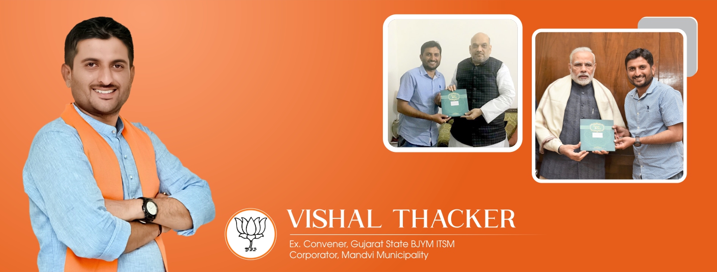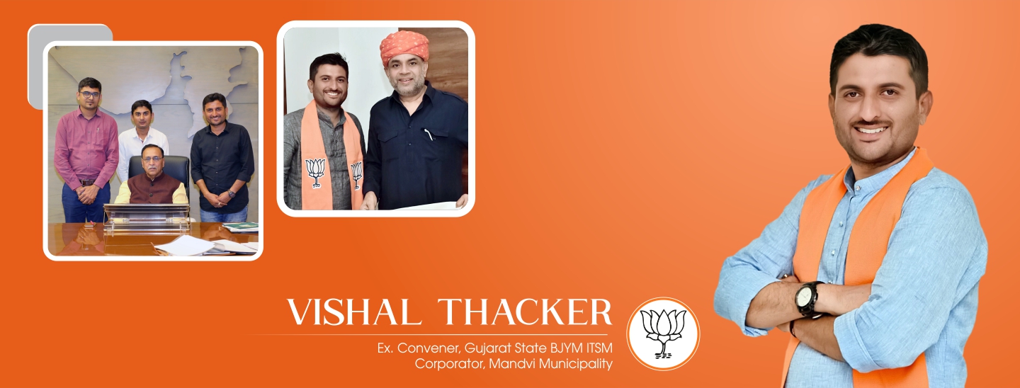Vishal R. Thacker is currently serving as Corporator in Mandvi Nagar Seva Sadan (Mandvi Municipality) and successfully served as Convener in Gujarat State BJYM IT & Social Media. Being inspired by the stories of great leaders of nation since young age, he has been also actively involved in various social and political activities of Bhartiya Janata Party.
